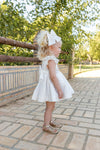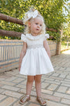 This hand-smocked ivory dress is perfect for any special occasion or ceremony. The front of the dress is pleated and has a beige hand-smocked detail. It features a ruffled collar with beige smocking. The dress has frill sleeves, and it ties on the back with a bow.