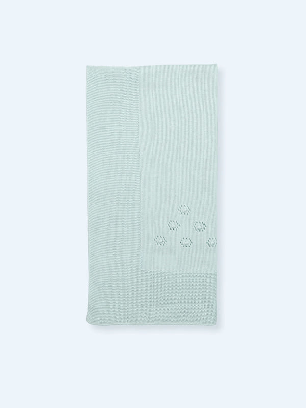 Knit blanket with openwork detail. Available in pale green, light beige and white. It matches newborn set Aiguablava.