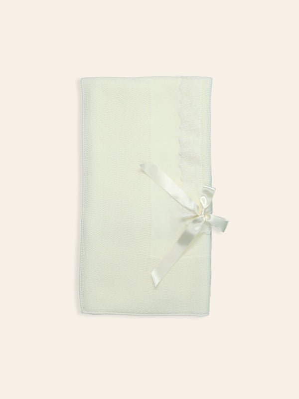 Knit blanket Iluminar in ecru. It has lace detail and a matching satin bow. It matches newborn set Iluminar.