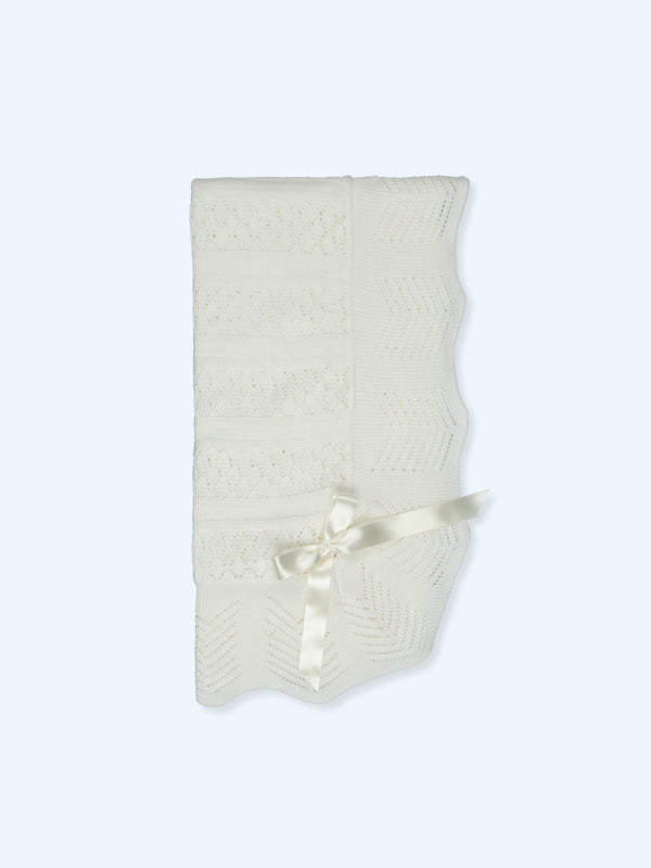 Knit blanket Specially has a beautiful intricate detail and a satin bow. It matches knit set Specially, sold separately.