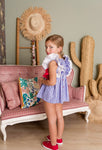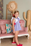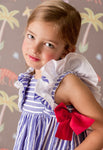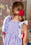 Blue and white striped dress with matching bloomers. The sleeveless dress has white ruffles around the arm openings and red bows on each side. It fastens on the back with buttons. Super cute and fun summer dress for little girls.