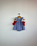 Blue and white striped dress with matching bloomers. The sleeveless dress has white ruffles around the arm openings and red bows on each side. It fastens on the back with...