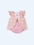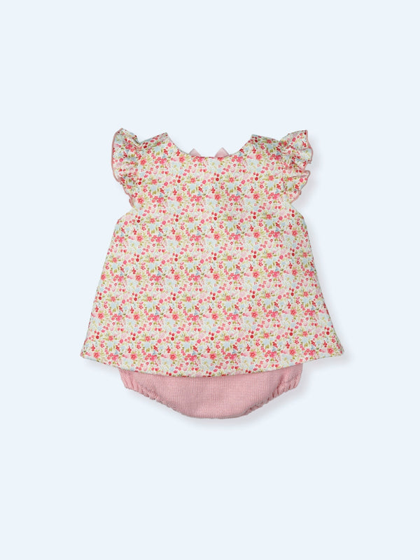Baby girl bloomer set made in a floral pink fabric. The sleeveless blouse fastens with two satin pink bows on the back. The knit pink bloomer is elasticated around the waist.