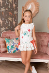 Cute and comfy girl set, it includes a cotton shirt and bloomers. The sleeveless shirt has a ruffled collar and a cute sea motive print. It fastens on the back with a keyhole button closure. The cute, ruffled bloomers in the same sea motive print are elasticated around the waist and have red bows on each side.