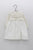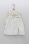 Baby girl knit and woven dress in a cream color. The top part is knitted and has a ruffled collar with cut-out detailing. The bottom part is woven. It fastens...