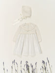 Baby girl knit and woven dress in a cream color. The top part is knitted and has a ruffled collar with cut-out detailing. The bottom part is woven. It fastens on the back with buttons. There is a matching bonnet.