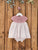 Knit and woven dress for baby girl. Made in a white fabric with a pink floral print, the top part is knitted in a powder pink color. The dress comes with matching bloomers, and it fastens on the back with buttons. There is a matching option for toddler girls.