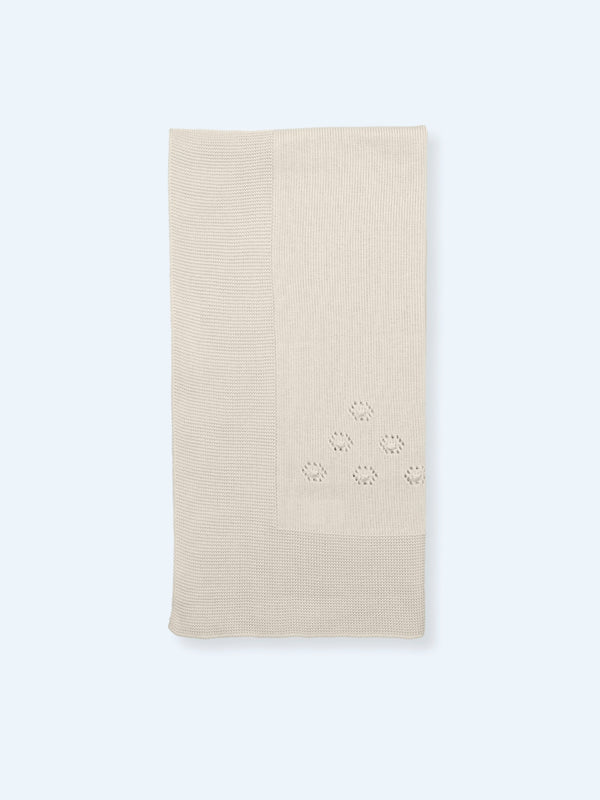 Light beige knit blanket with openwork detail. It matches newborn set Aiguablava.