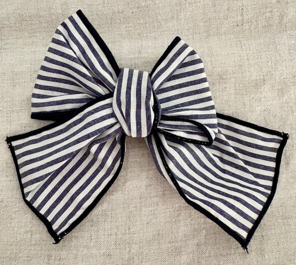 Hair bow with clip in the Moon navy-blue and white striped fabric.
