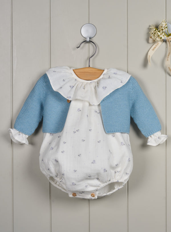 Beautiful romper for newborn babies made in soft cotton muslin in a cute greyish blue bird print. It has an oversized ruffled collar and long sleeves with elasticated frill cuffs. It fastens with wooden buttons on the back and between the legs for additional comfort. Cardigan not included.