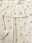 Beautiful romper for newborn babies made in soft cotton muslin in a cute greyish blue bird print. It has an oversized ruffled collar and long sleeves with elasticated frill cuffs. It...