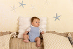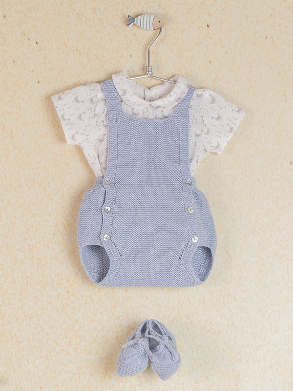Shirt and knit romper set for baby boys. The short-sleeved white shirt is made in a lightweight cotton fabric in a cute duck print. It has a Peter Pan collar and it fastens with buttons on the back. The knit blue romper fastens with mother-of-pearl buttons on the front and back, and it features cross back straps. Mebi is a small fitting brand. We recommend sizing up.