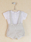 Dungarees set for baby boy. The short-sleeved, white collarless shirt is made in a lightweight linen and it fastens with 2 buttons on the front. The sage green and white cotton striped shorts are elasticated on the back and around the leg openings. They feature cross back straps that fasten on the front with mother of pearl buttons. Mebi is a small fitting brand. We recommend sizing up. There is a matching option for toddler boys.