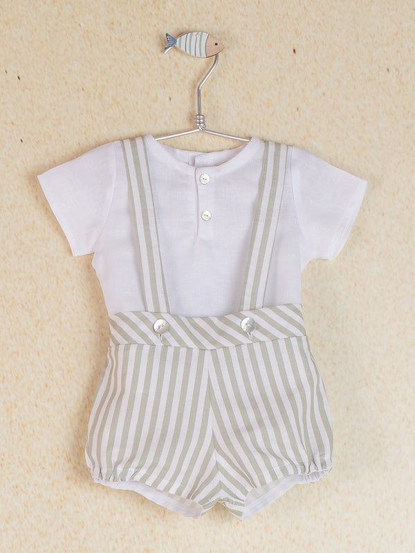 Dungarees set for baby boy. The short-sleeved, white collarless shirt is made in a lightweight linen and it fastens with 2 buttons on the front. The sage green and white...