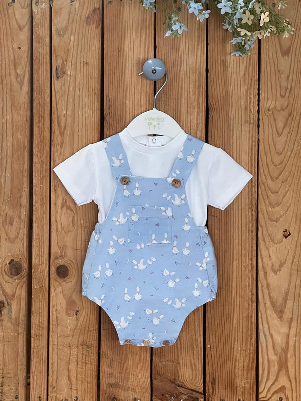 Cute dungarees set for baby boy. The short-sleeved white cotton shirt fastens with buttons on the back. The blue dungarees feature a cute duck print. They feature a frontal pocket, and they fasten with wooden buttons on the straps and in between the legs.