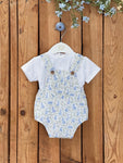 Cute dungarees set for baby boy. The short-sleeved white cotton shirt fastens with buttons on the back. The white dungarees feature a cute blue bunny print. They feature a frontal...