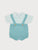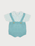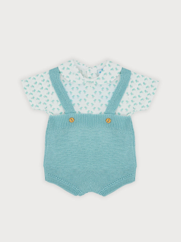 This dungarees set for baby boys includes a short-sleeved blouse and knitted green dungarees. The white blouse features a cute green chicken print and a Peter Pan collar. It fastens with buttons on the back. The green knitted dungarees fasten on the front with wooden buttons.