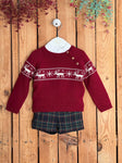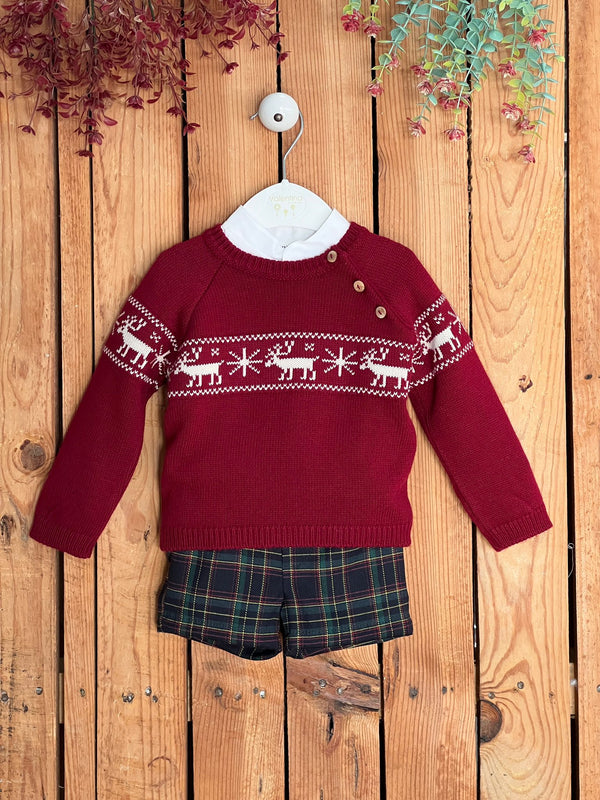 3-piece boy set, it includes a shirt, shorts and sweater. The white cotton shirt features long sleeves and fastens on the front with buttons. The shorts are made in a beautiful blue and green tartan fabric. The dark red knit sweater features a reindeer print all around, and it fastens on the shoulder with wooden buttons. This cute set is perfect for the holiday season.