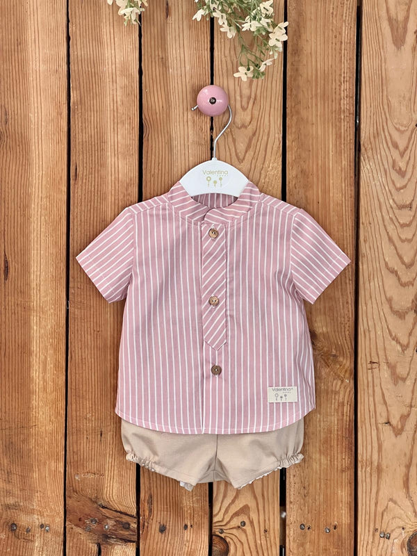 Toddler boy shorts set. The short-sleeved shirt is made in a powder pink striped fabric. It has no collar, and it fastens with buttons on the front. The beige shorts...