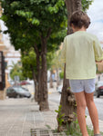Cute shorts set for boys. Made in lightweight seersucker fabric, the long-sleeved white and lime yellow gingham dress has no collar, and it fastens with 3 buttons on the front. It features a frontal pocket. The blue and white striped shorts, also made in seersucker, are elasticated around the waist for additional comfort.