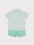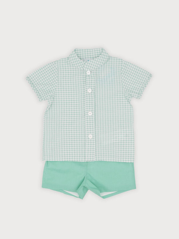 Shirt and shorts set for boys. The short-sleeved collarless shirt is made in a green and white lightweight gingham fabric. It fastens with buttons on the front. The green shorts feature an elasticated waistband for additional comfort.