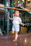 This formal set for toddler boys features a shirt and shorts. The short-sleeved ivory shirt features a Peter Pan collar and a gorgeous hand smocked light blue panel. It fastens on the back with buttons. The pale blue shorts are elasticated around the waistline and feature pockets.
