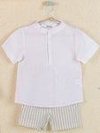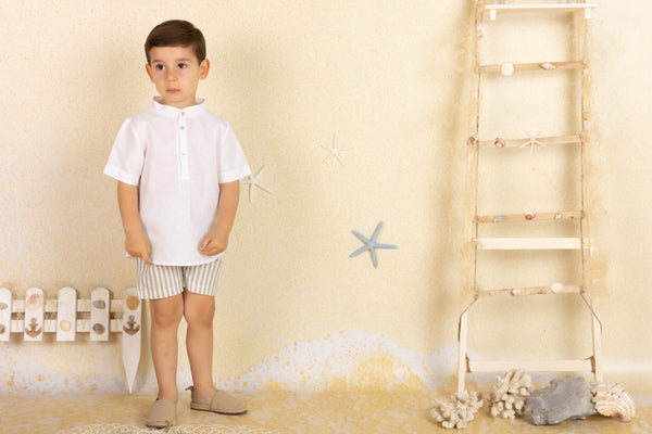 Shorts set for toddler boy. The short-sleeved, white collarless shirt is made in a lightweight linen and it fastens with 3 buttons on the front. The sage green and white...