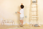 Shorts set for toddler boy. The short-sleeved, white collarless shirt is made in a lightweight linen and it fastens with 3 buttons on the front. The sage green and white cotton striped shorts feature an elasticated waistband for additional comfort. Mebi is a small fitting brand. We recommend sizing up.