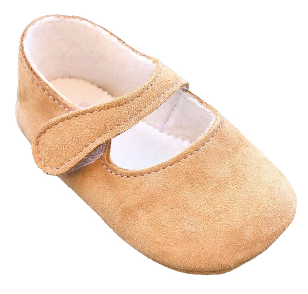 Suede leather pre-walker Mary Jane shoes with velcro fastening. Available in pink and taupe