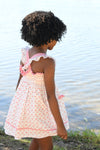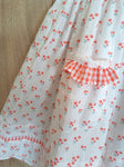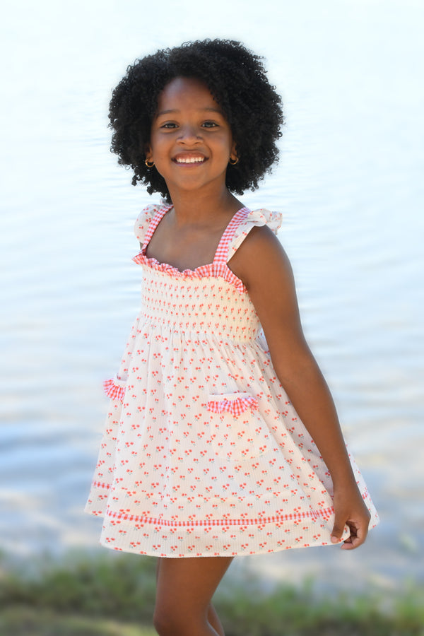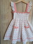Beautiful white summer dress in a small floral coral print. It has an elasticated body and cross-back ruffled straps. The straps and frontal pockets have a white and coral gingham...