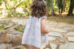 Hand-smocked bishop dress. Made in a sweet pink liberty fabric, it features a green and yellow smock detail around the neckline and flutter sleeves. Made in cotton, it fastens with buttons on the back and comes with matching bloomers.
