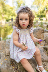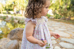 Hand-smocked bishop dress. Made in a sweet pink liberty fabric, it features a green and yellow smock detail around the neckline and flutter sleeves. Made in cotton, it fastens with...