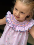 Hand-smocked bishop dress. Made in a pink and white striped fabric with multicolor embroidered dots, it features a gorgeous hand-smocked ruffled collar. Made in cotton, it fastens with buttons on...