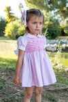 This hand-smocked pink dress is perfect for any special occasion or ceremony. It features a gorgeous smocked panel on the front, a Peter Pan smocked collar and puff sleeves. It ties on the back with a bow.