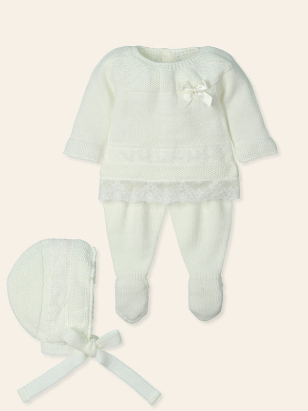 3-piece knit set in ecru. It includes a long-sleeved sweater, footies and a bonnet. The sweater has a lace detail and is adorned with a small satin bow. It fastens with buttons on the back. The footies are gently elasticated around the waist. Matching blanket available.