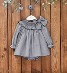 Dress made in a striped navy blue and white cotton fabric. It features a beautiful smocked ruffled collar with a bow. The dress has long elasticated sleeves and it fastens with buttons on the back. It comes with matching bloomers. Matching hair bow available.