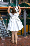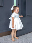 This classic hand-smocked ivory dress is perfect for any special occasion or ceremony. It features a gorgeous light blue smocked panel on the front, a Peter Pan smocked collar and puff sleeves. It fastens on the back with mother-of-pearl buttons and a bow. Matching option available for boys.