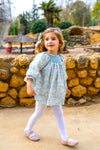 This hand-smocked bloomer set is made in a pastel pink, blue and yellow floral print fabric. It features beautiful blue and yellow smocking around the neckline and long elasticated sleeves. Made in cotton, it fastens with mother-of-pearl buttons on the back and comes with matching elasticated bloomers.