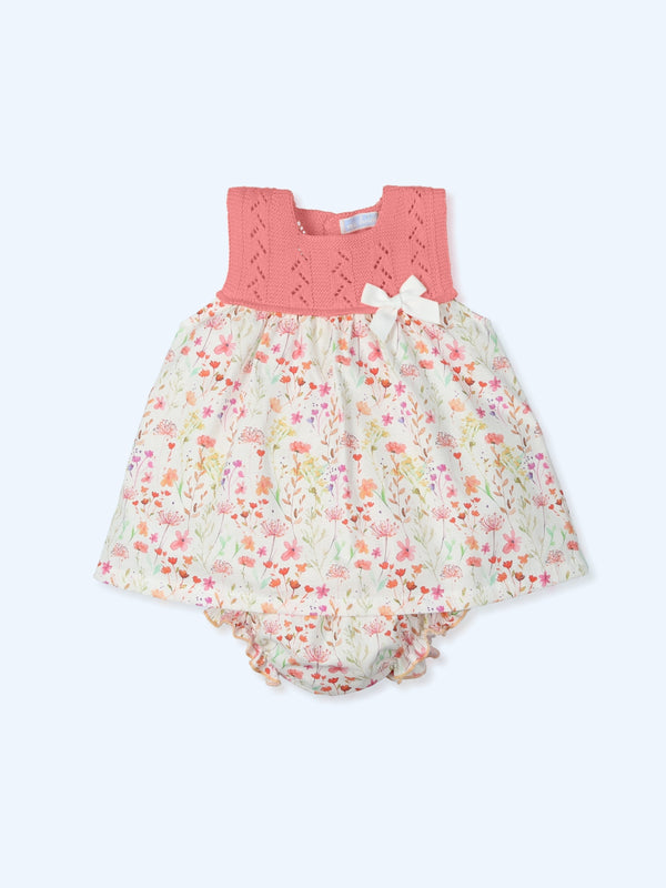 Baby girl floral dress with knitted body. The bodice of the dress is knitted in a coral color. The skirt is made in a bright floral fabric. It fastens on the back with buttons and comes with matching bloomers.