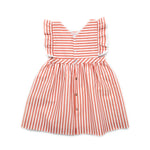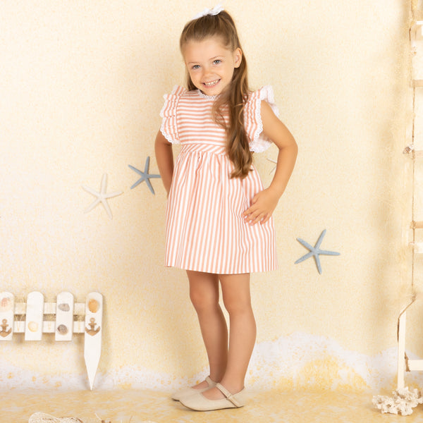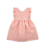 Striped terracotta pink and white dress for girls, made in a blend of linen and cotton. This sleeveless dress features ruffles around the arm openings and a cute V-neckline and...