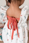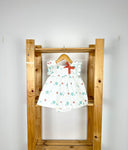 White summer dress in a cute sea motive print. It has ruffles around the arm openings and is adorned with a red ribbon on the front. It fastens with a red ribbon on the back. It comes with matching bloomers up to size 24 months.