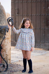 Cute dress in a yellow, red and blue liberty print. It features long sleeves and fastens with a zipper on the back. The dress features a cute ruffle around the...