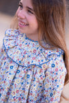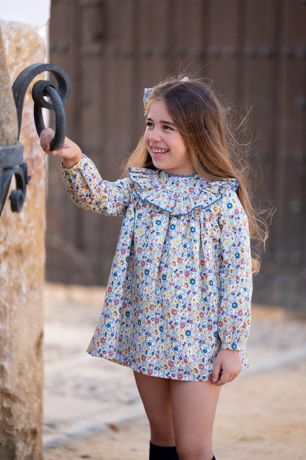 Cute dress in a yellow, red and blue liberty print. It features long sleeves and fastens with a zipper on the back. The dress features a cute ruffle around the round neckline and shoulders.