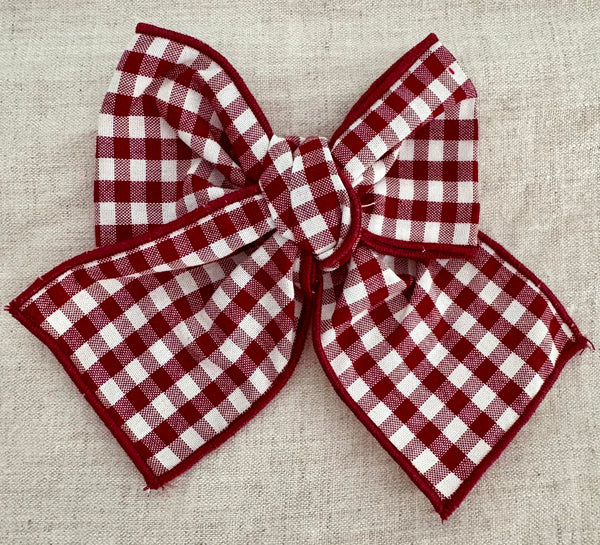 Hair bow with clip in the Paris burgundy and white gingham fabric.