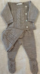 Three-piece light brown knit set for baby boys and girls. It includes a long-sleeved sweater, footies and a bonnet. Knitted in soft cotton, the top features a square neckline and it fastens with mother-of-pearl buttons on the side. The footies are gently elasticated around the waist.