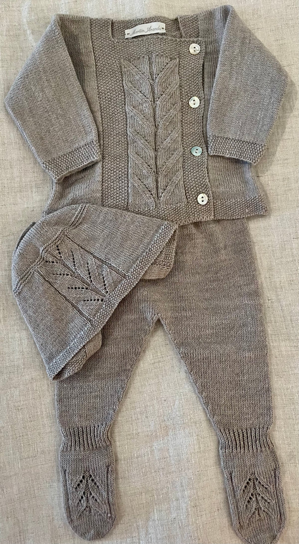 Three-piece light brown knit set for baby boys and girls. It includes a long-sleeved sweater, footies and a bonnet. Knitted in soft cotton, the top features a square neckline and...
