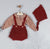 Baby boy dungarees set, it includes a shirt and knitted dungarees in a tile color. The shirt is made in a tile and ivory gingham fabric. It has a Peter Pan collar, long elasticated sleeves and it fastens with buttons on the back. The knit dungarees have straps that fasten on the front with wooden buttons. Bonnet not included. Mebi is a small fitting brand, we recommend sizing up.