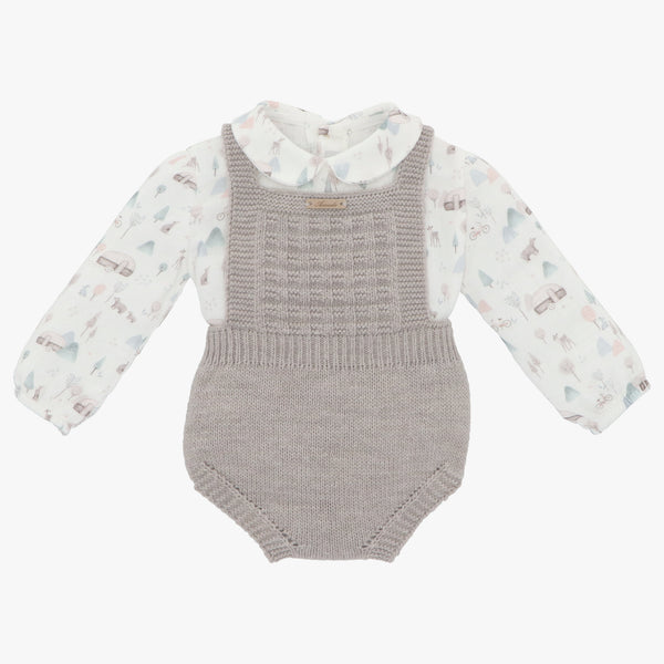 Baby boy shirt and dungarees set. The long-sleeved white shirt has a delicate print in pastel hues. It has a Peter Pan collar and it fastens on the back with buttons. The knit taupe dungarees have cross-back straps and they fasten between the legs.