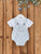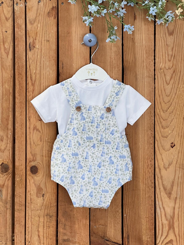 Cute dungarees set for baby boy. The short-sleeved white cotton shirt fastens with buttons on the back. The white dungarees feature a cute blue bunny print. They feature a frontal pocket, and they fasten with wooden buttons on the straps and in between the legs.