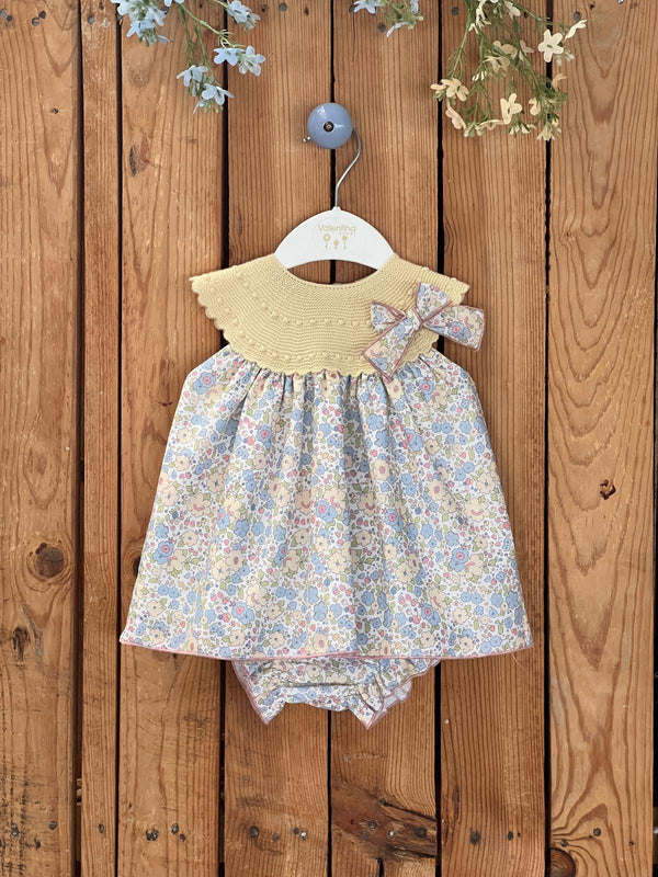 Knit and woven dress for baby girl. Made in a beautiful yellow liberty fabric with soft-hued tones, the top part is knitted in a pale yellow color and it is adorned with a bow in the same liberty fabric. The dress comes with matching bloomers, and it fastens on the back with buttons. There is a matching option for toddler girls.